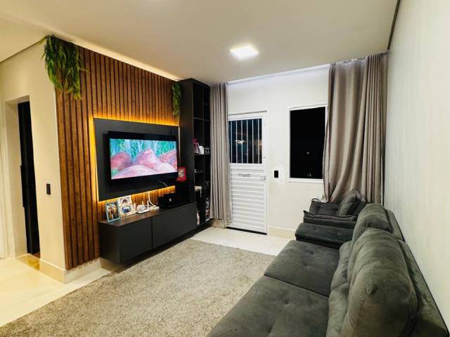 Sala ampla com lindo painel de madeira, rebaixamento em gesso e suporte para TV iluminado;